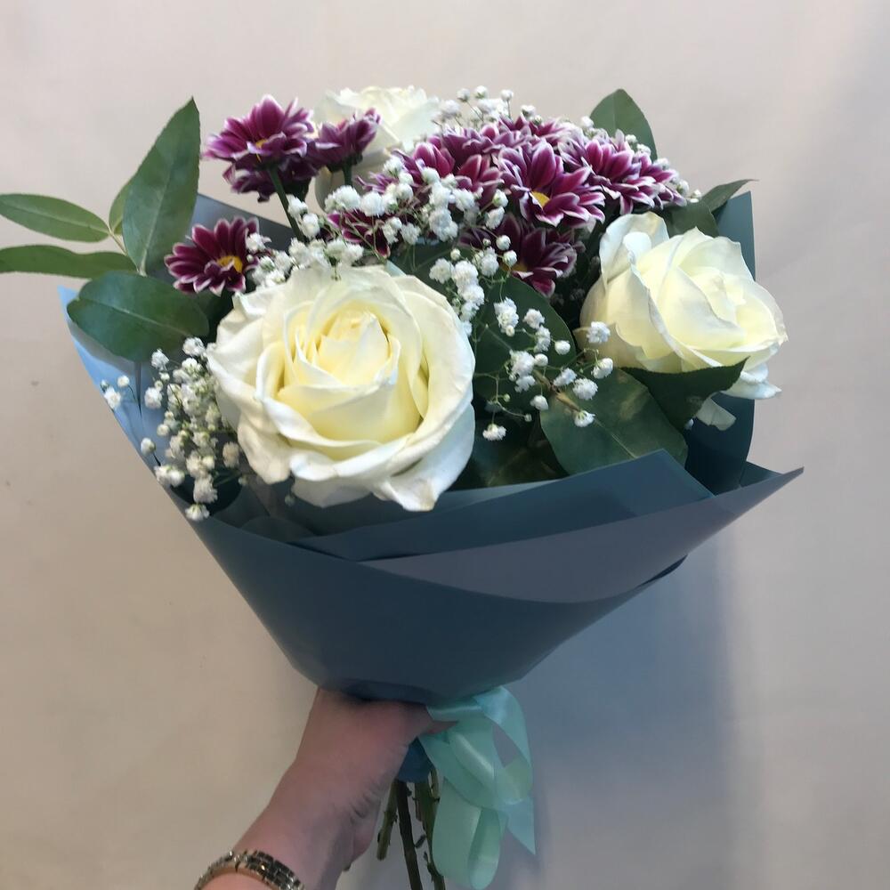 Гипсофила – 1 шт.Упаковка дизайнерская – 1 шт.Хризантема кустовая хайдар – 3 шт.роза белая 50 см полар стар – 3 шт.рускус рабуста – 3 шт.