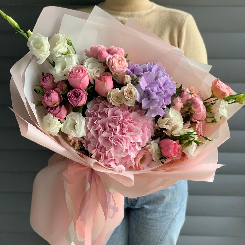 Альстромерии, Кустовые розы, Лизиантусы, Пионовидные розы, Розы, Ромашки