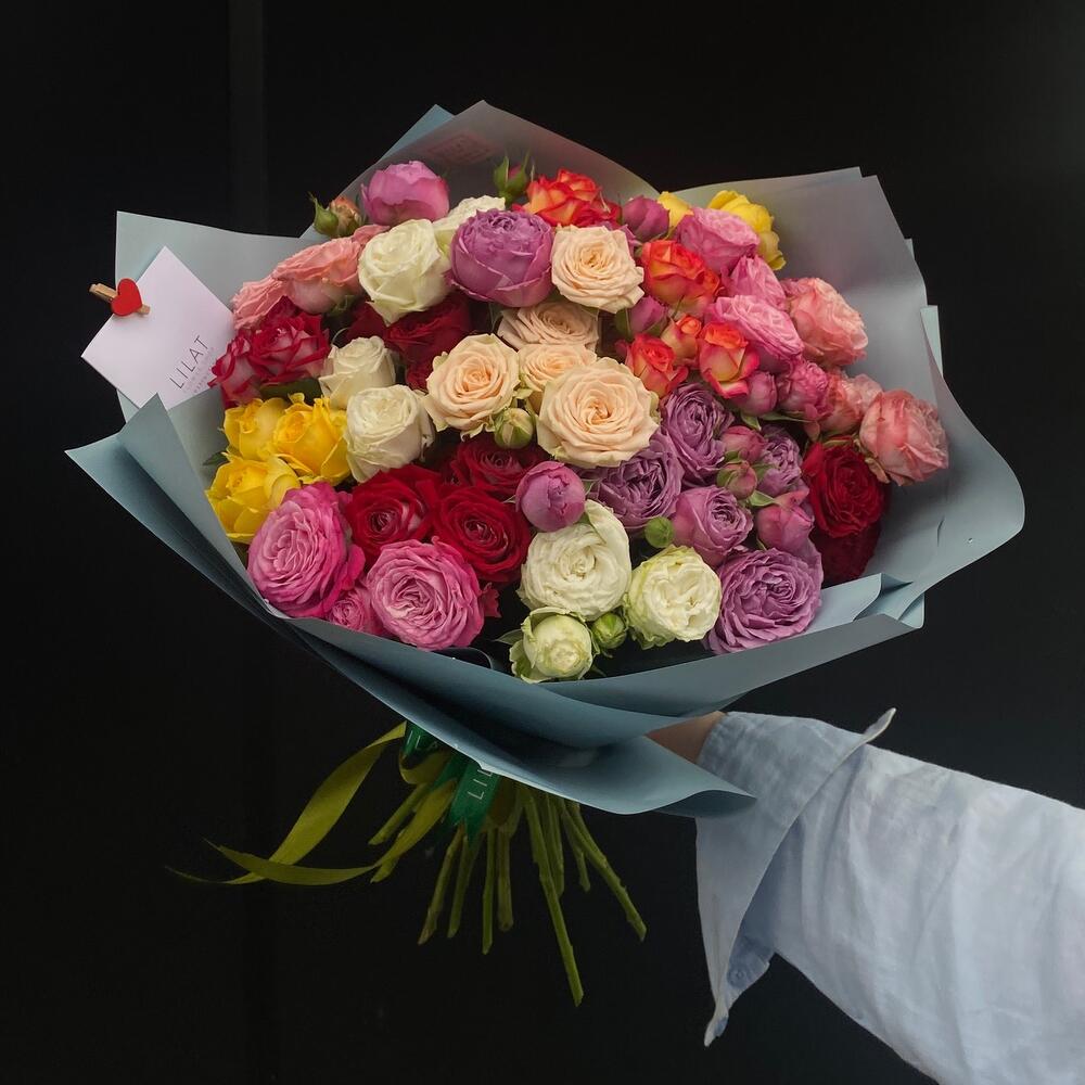 Пионовидная кустовая роза – 15 шт. Открыточка с вашими пожеланиями – 1 шт. Упаковка дизайнерская – 1 шт. инструкция по уходу за цветами – 1 шт.