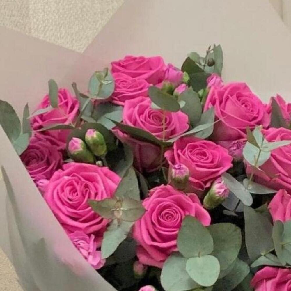 Букет из розовых роз и эвкалипта «Искушение»