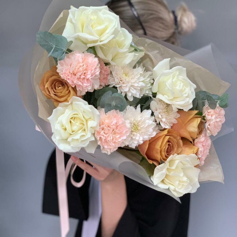 Гвоздики, Кустовые розы, Пионовидные розы, Розы