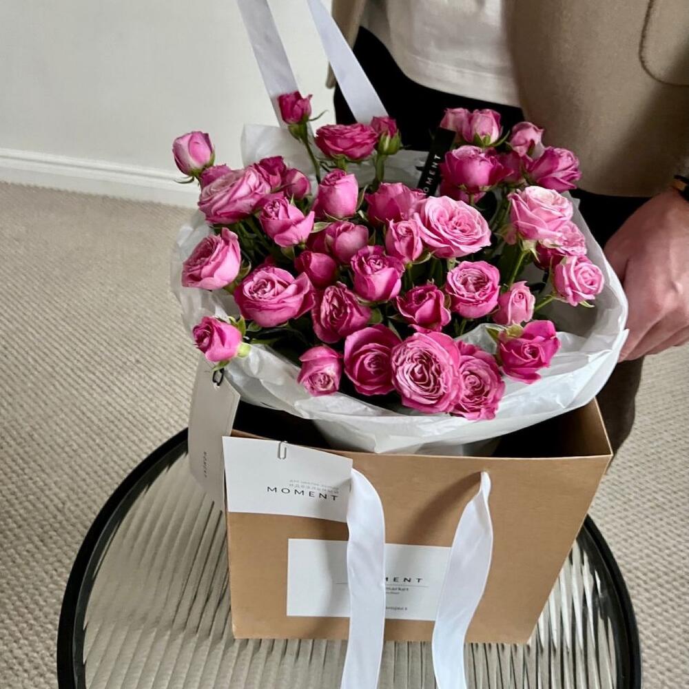 Тишью – 2 шт.Крафт – 2 шт.Карточка для подписи – 1 шт.крафтовый пакет – 1 шт.розы кустовые – 9 шт.