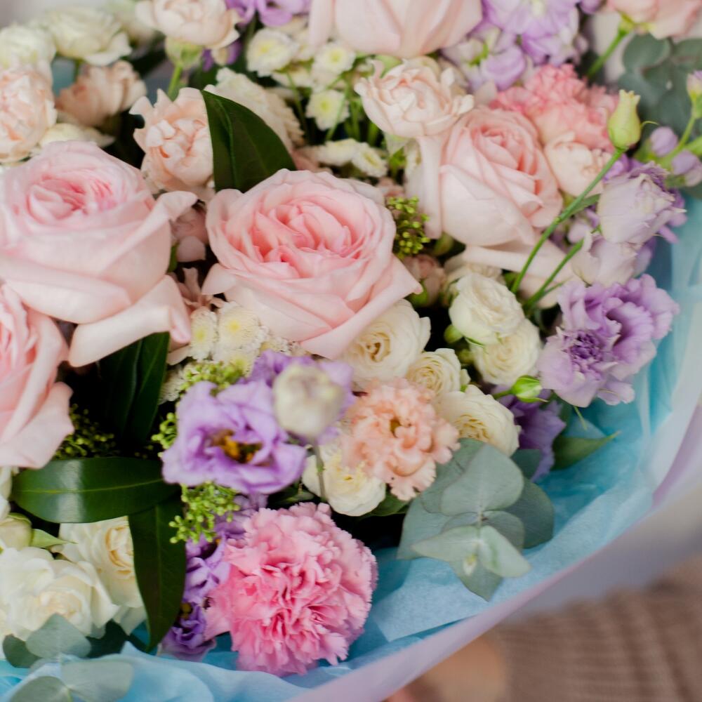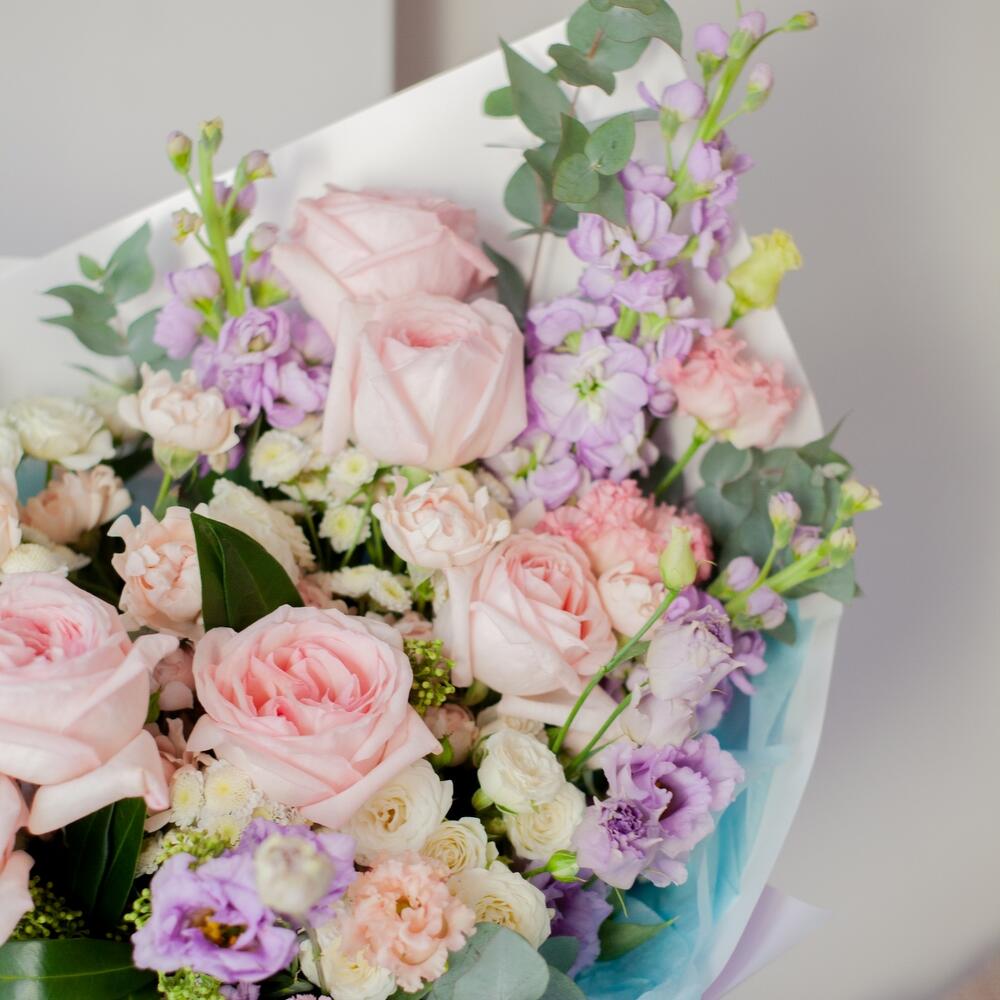 Хризантема сталион – 4 шт.Лизиантус – 5 шт.роза охара пионовидная – 8 шт.Маттиола – 4 шт.Диантус – 8 шт.Роза кустовая – 5 шт.Скиммия – 4 шт.Эвкалипт – 5 шт.Упаковка дизайнерская – 1 шт.