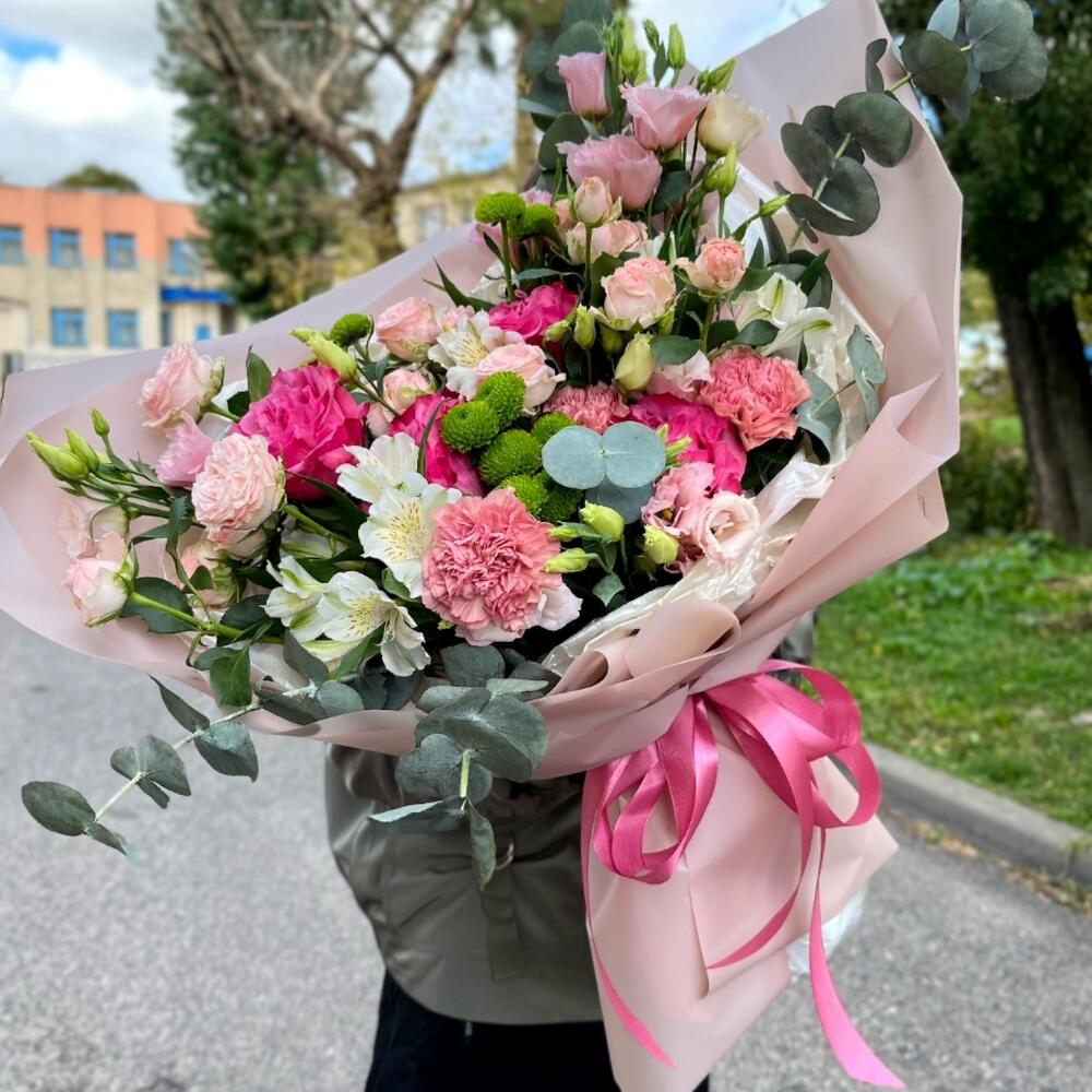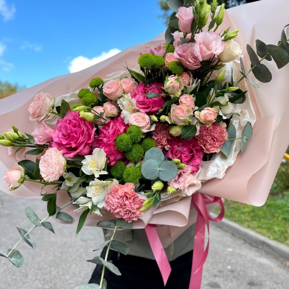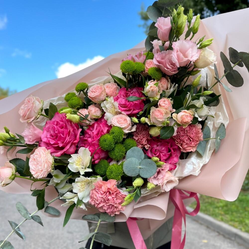 Гвоздики, Лизиантусы, Розы, Тюльпаны