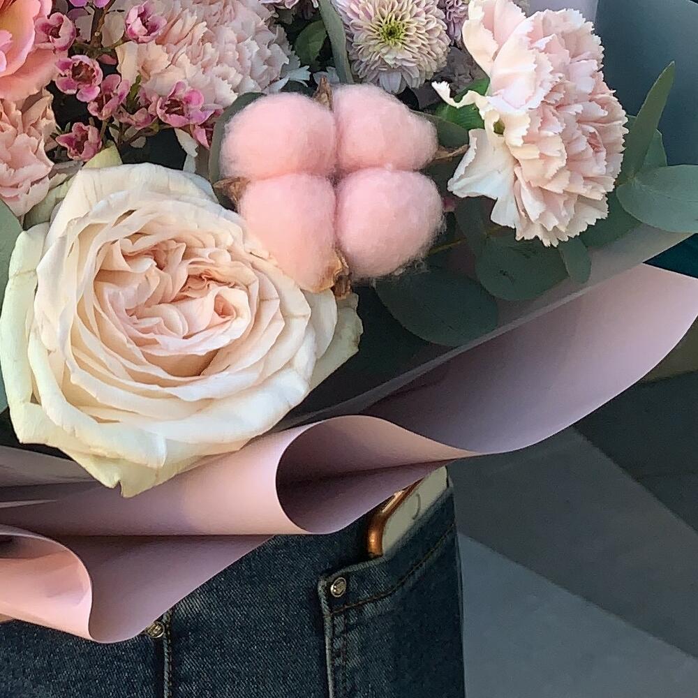 Роза пионовидная кустовая – 1 шт.Хлопок – 1 шт.Хризантема кустовая – 1 шт.Диантус – 3 шт.Хамелациум – 1 шт.Маттиола – 2 шт.Эвкалипт – 3 шт.