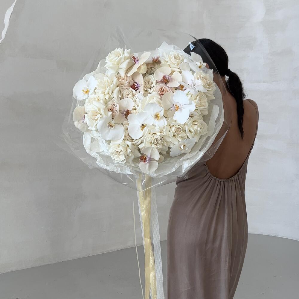 роза пионовидная плая бланка – 36 шт.Орхидея Фаленопсис – 19 шт.тишью кремовое – 1 шт.Слюда – 1 шт.открытка брендированная в подарок – 1 шт.