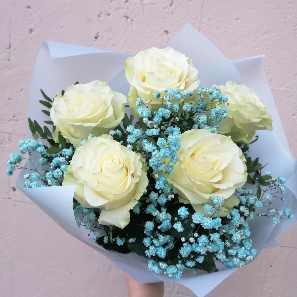 Лента – 1 шт.Роза Эквадор – 5 шт.Упаковка – 2 шт.Гипсофила голубая – 1 шт.зелень декоративная – 1 шт.