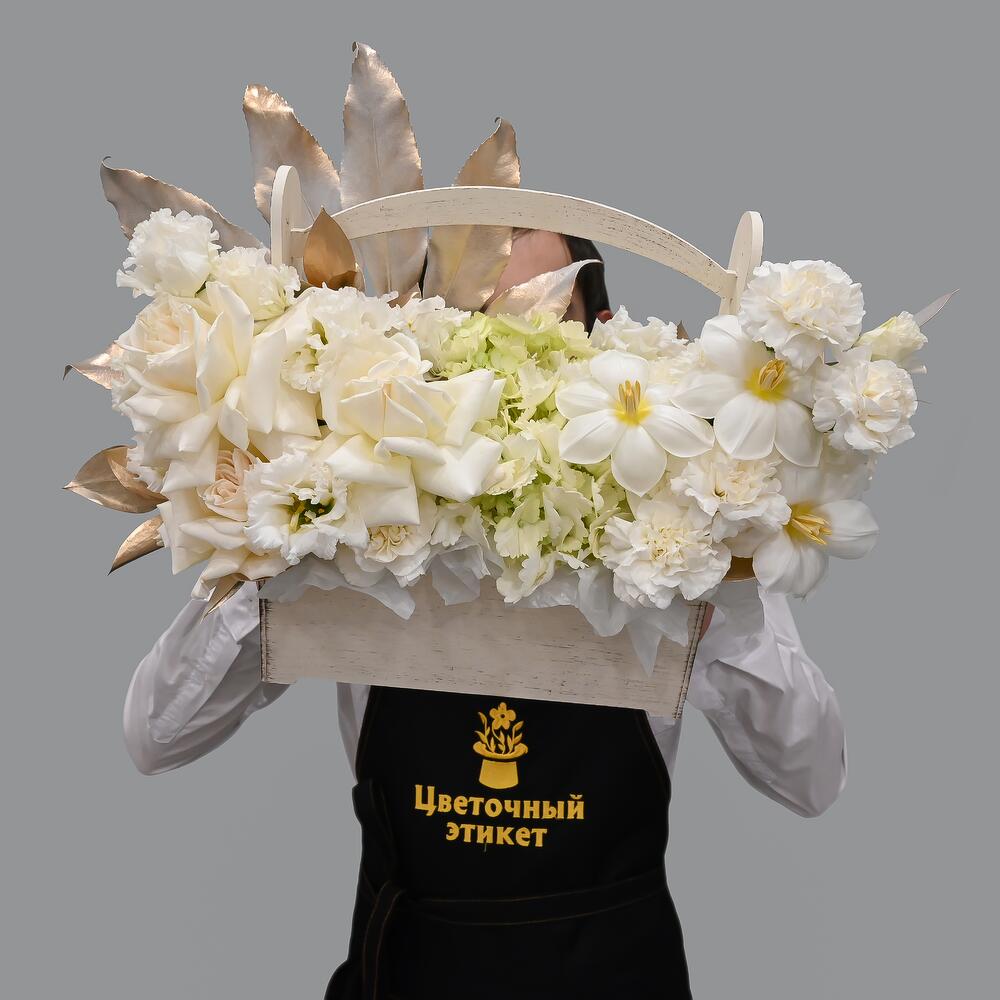 Французская роза – 3 шт.Эустома – 4 шт.Гвоздика – 7 шт.Тюльпан – 3 шт.Гортензия – 1 шт.Рускус – 5 шт.Аралия – 1 шт.Тишью – 2 шт.Ящик деревянный – 1 шт.