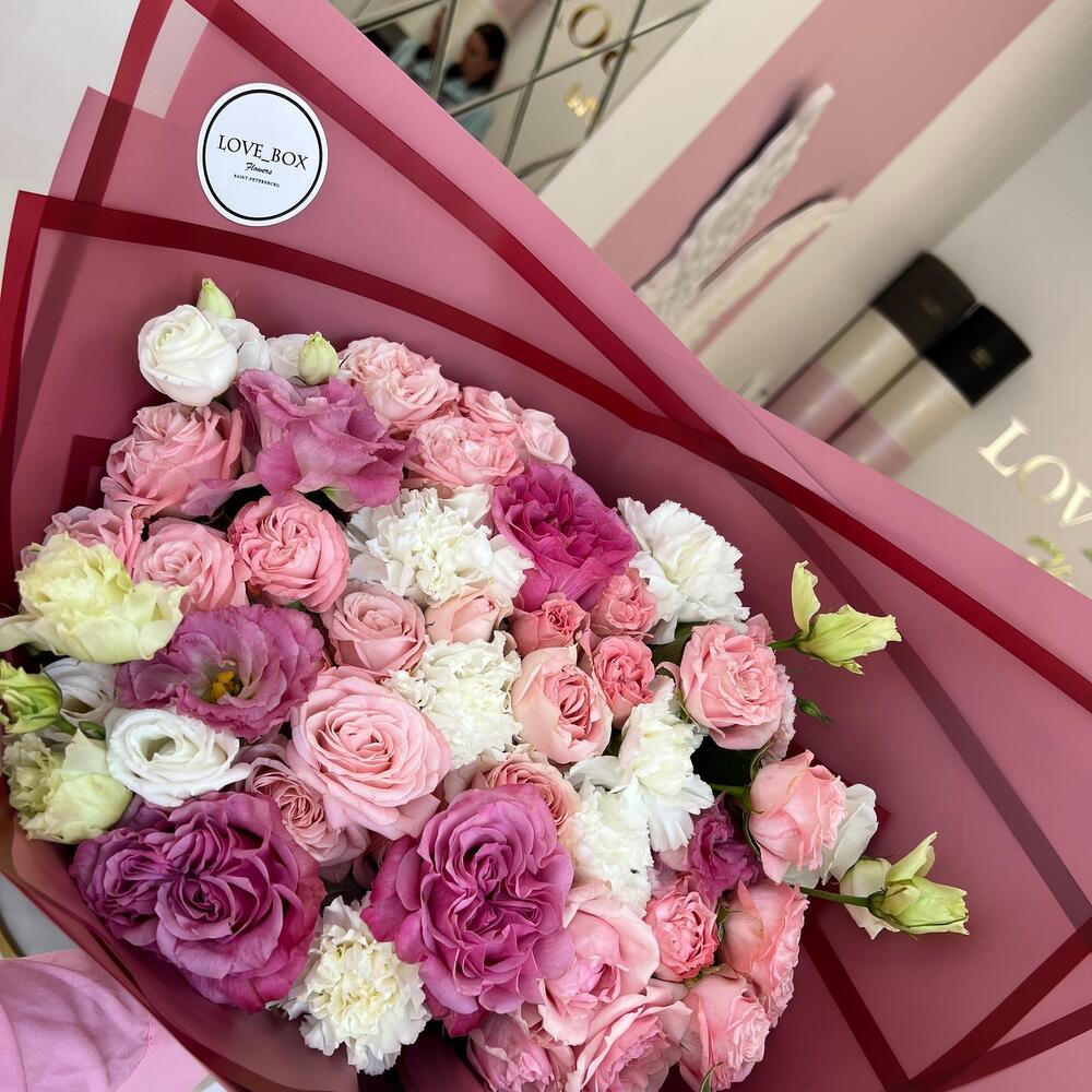 Пионовидная роза – 3 шт.Кустовая роза – 7 шт.Диантус – 5 шт.Эустома – 4 шт.Авторская упаковка – 5 шт.