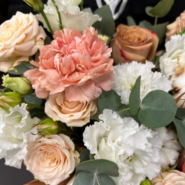 Роза Капучино – 2 шт.Хлопок – 2 шт.Эвкалипт – 2 шт.Лента атласная – 2 шт.Тишью – 1 шт.Диантус – 1 шт.Коробка шляпная – 1 шт.Оазис флористический – 1 шт.эустома махровая белая – 2 шт.Маттиола априкот – 1 шт.роза кустовая таня – 1 шт.