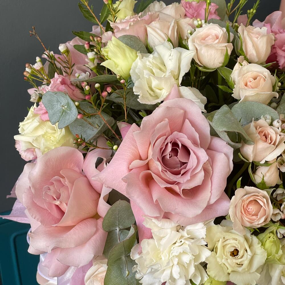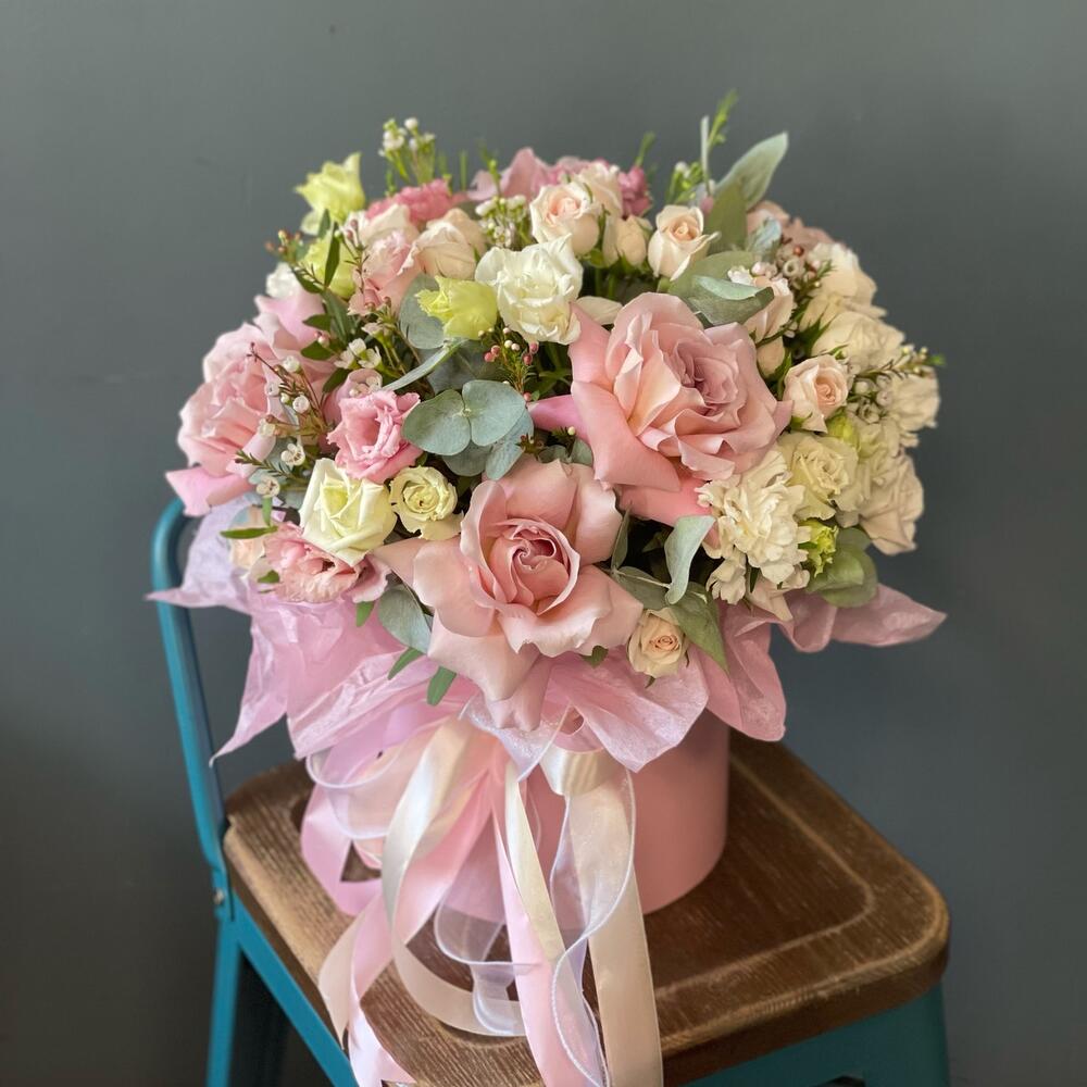 Ваксфлауэр – 2 шт.Лента – 3 шт.Лизиантус – 3 шт.Роза кустовая – 4 шт.Эвкалипт – 2 шт.Роза одноголовая – 5 шт.Гвоздика – 5 шт.Тишью – 2 шт.Коробка шляпная – 1 шт.Фисташка – 3 шт.Оазис флористический – 1 шт.