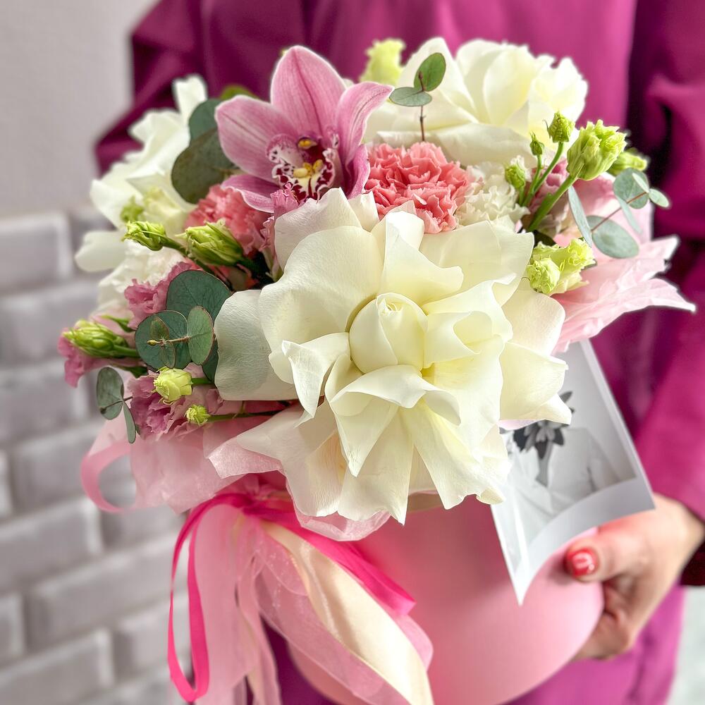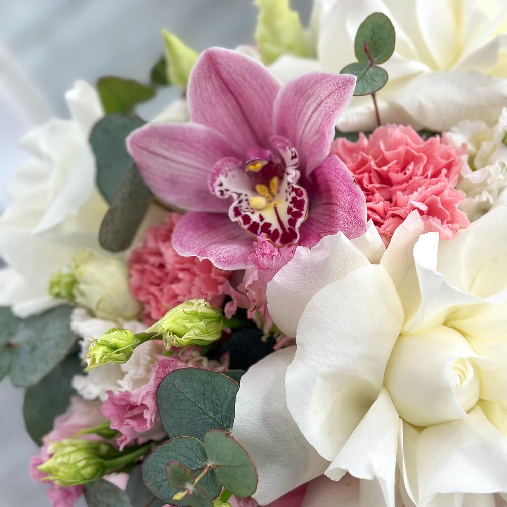 Орхидея Цимбидиум – 1 шт.Эвкалипт – 1 шт.Лизиантус махровый – 2 шт.Открыточка с вашими пожеланиями – 1 шт.роза плая бланка – 3 шт.диантус сортовой розовый – 3 шт.шляпная коробка с лентами и оазисом – 1 шт.