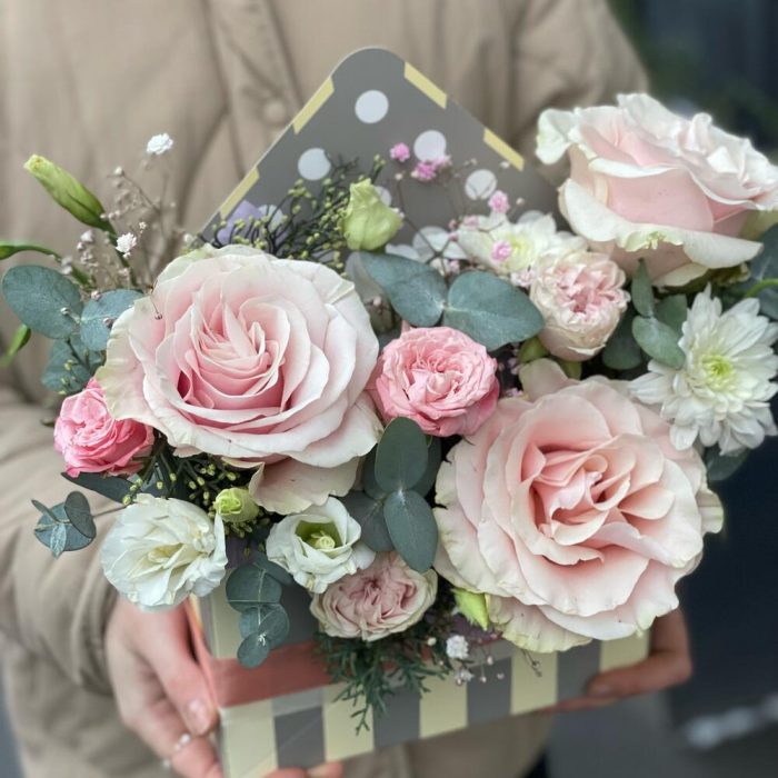 роза одноголовая пинк мондиаль – 3 шт.куст роза – 1 шт.эустома белая – 2 шт.Хризантема кустовая – 1 шт.Эвкалипт – 1 шт.Гипсофила – 1 шт.Зелень – 1 шт.