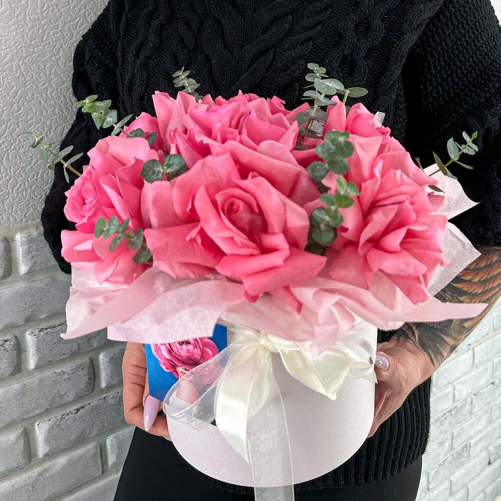 Тишью – 2 шт.Роза свит юник – 7 шт.Открыточка с вашими пожеланиями – 1 шт.Эвкалипт Baby Blue – 1 шт.подкормка для срезанных цветов – 1 шт.инструкция по уходу за цветами – 1 шт.шляпная коробка с лентами и оазисом – 1 шт.