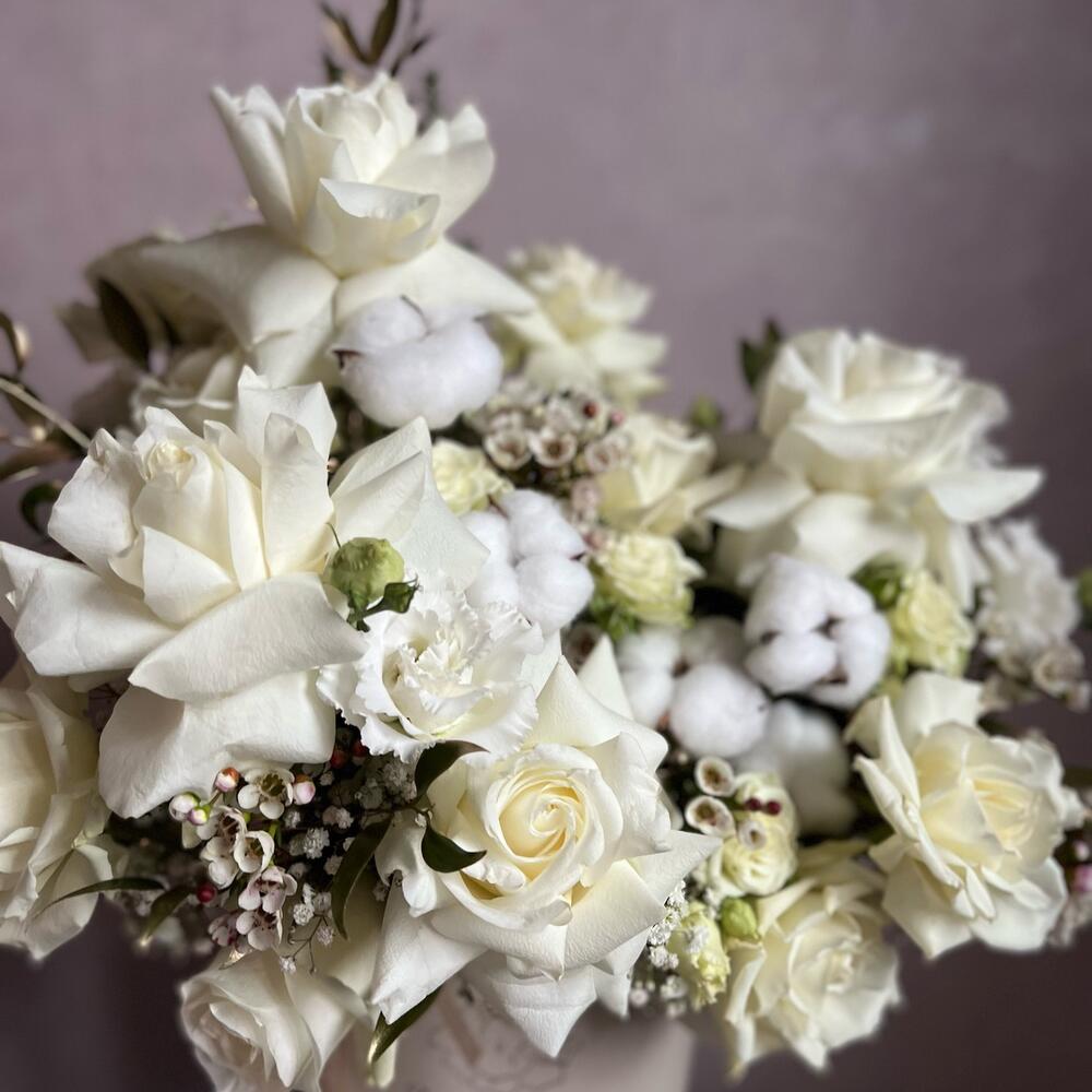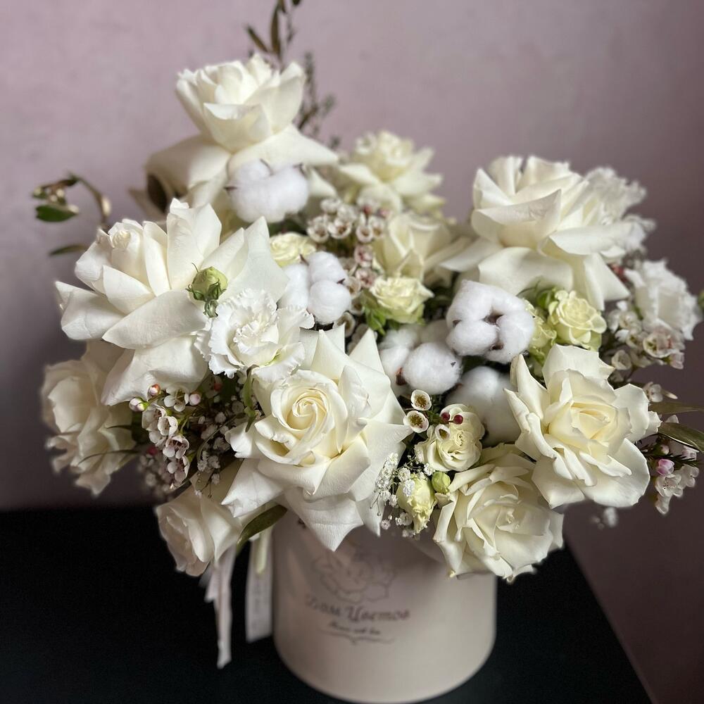 Белые сочетания в стильной шляпной коробке – это практичный и интересный подарок для любого праздничного события. Воздушная ассиметричная сборка и текстурные цветы создают объемную композицию, которая воодушевляет и дарит эстетическое удовольствие.Доставим быстро и бережно.* … Показать ещёК сожалению, мы не можем гарантировать 100% копию букета. Ежедневно к нам в салон приезжают свежие цветы и они могут отличаться друг от друга. Со своей стороны, мы гарантируем соблюсти состав и общий стиль вашего букета. При возникновении вопроса о замене дизайнерской упаковки – мы обязательно свяжемся с вами. Букет из живых цветов мы начинаем собирать после оформления заказа.