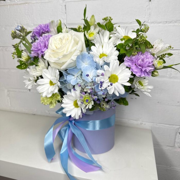 Хризантема кустовая – 3 шт.Диантус – 3 шт.Роза Эквадор – 1 шт.Гортензия – 1 шт.Фисташка – 3 шт.Оазис флористический – 1 шт.Шляпная коробка с лентами – 1 шт.