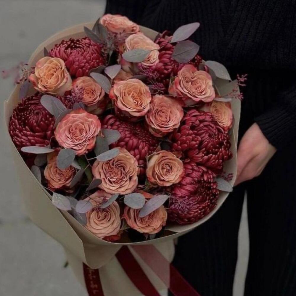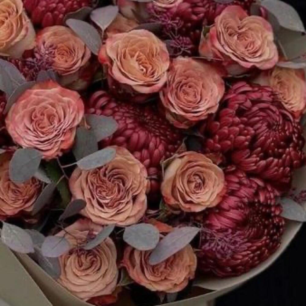 Гвоздики, Кустовые розы, Пионовидные розы, Розы