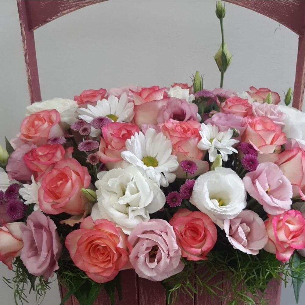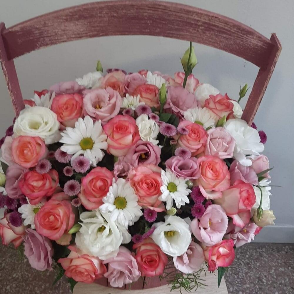 Альстромерии, Гвоздики, Кустовые розы, Лизиантусы, Розы, Хризантемы