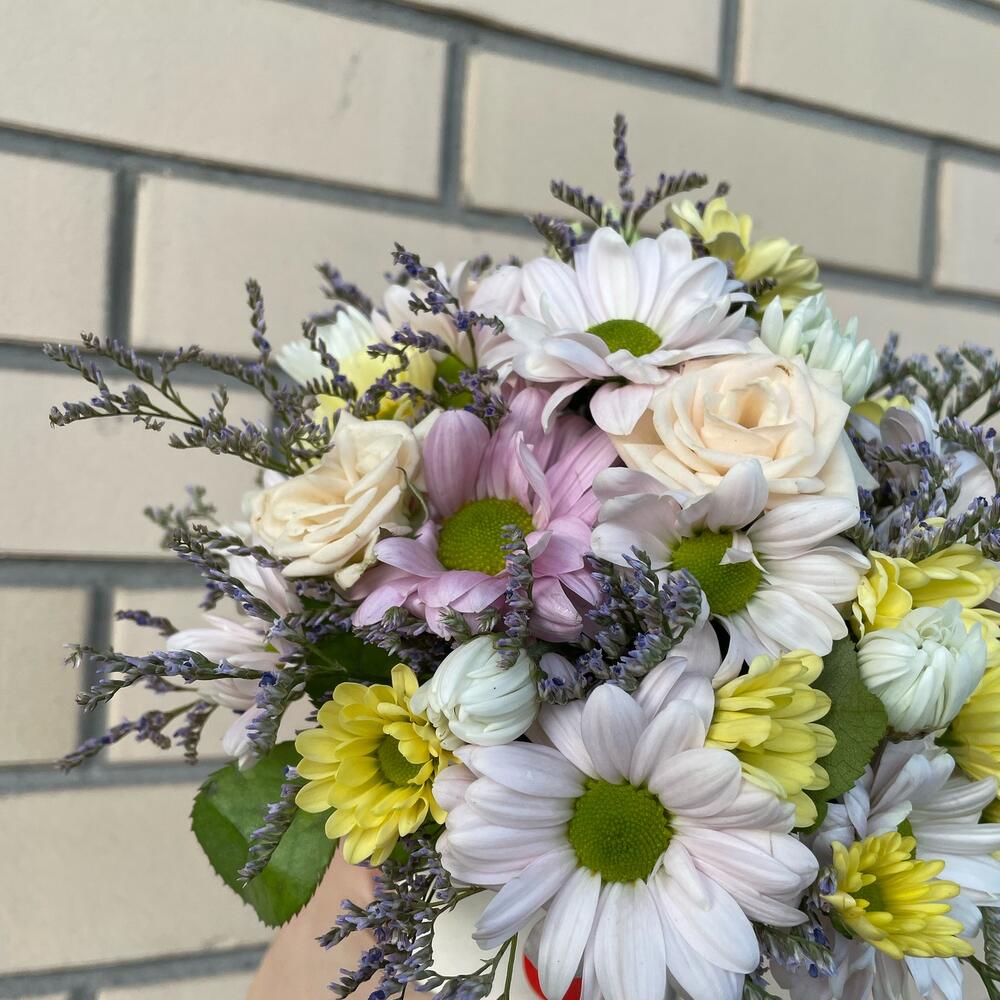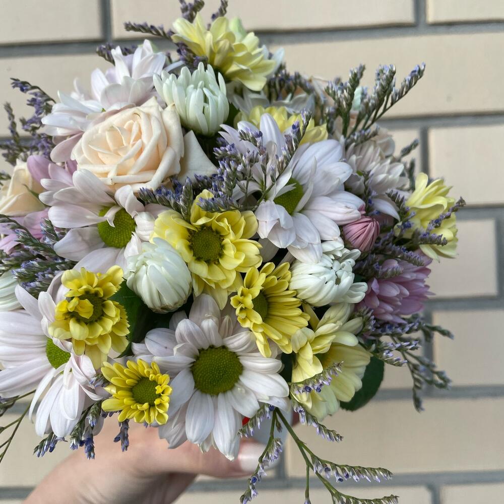 Хризантема кустовая – 2 шт.Роза кустовая – 1 шт.Лимониум – 1 шт.Губка флористическая – 1 шт.стакан кофейный – 1 шт.