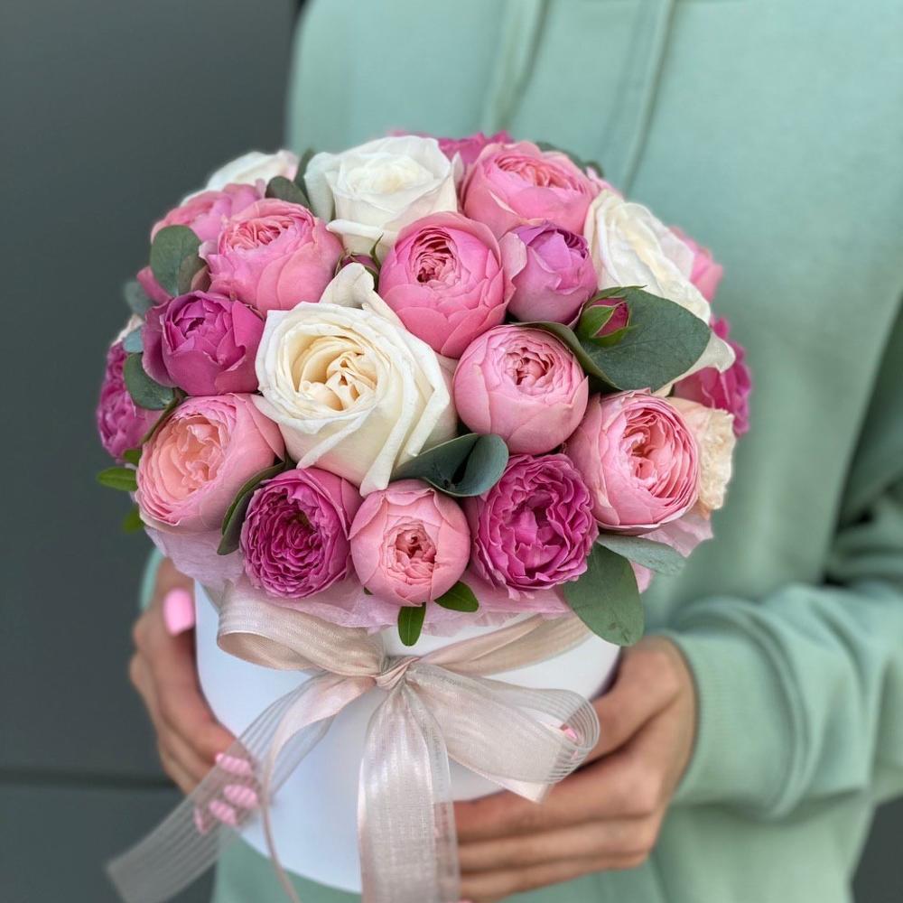 Эвкалипт – 1 шт. Роза одноголовая – 1 шт. Кустовая пионовидная роза – 7 шт. Писташ – 1 шт. Коробка – 1 шт. оформление атласные ленты – 1 шт. Оазис – 1 шт.