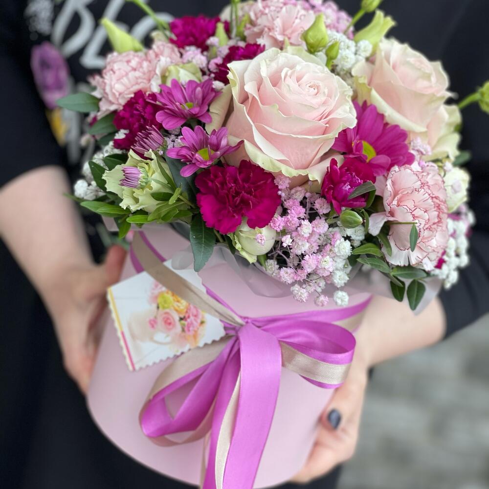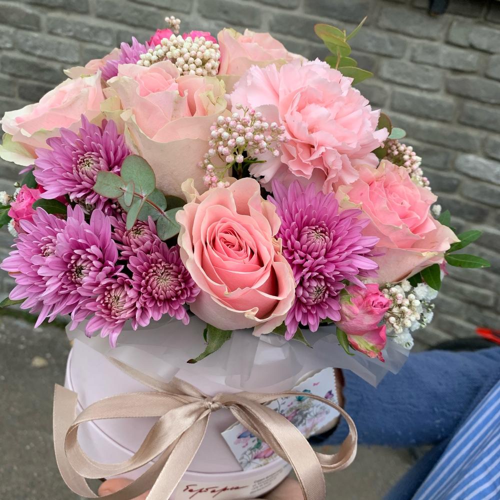 Круглая коробка шляпная с живыми цветами, в составе могут быть розы, гвоздики, хризантемы или любые , указанные вами акценты.