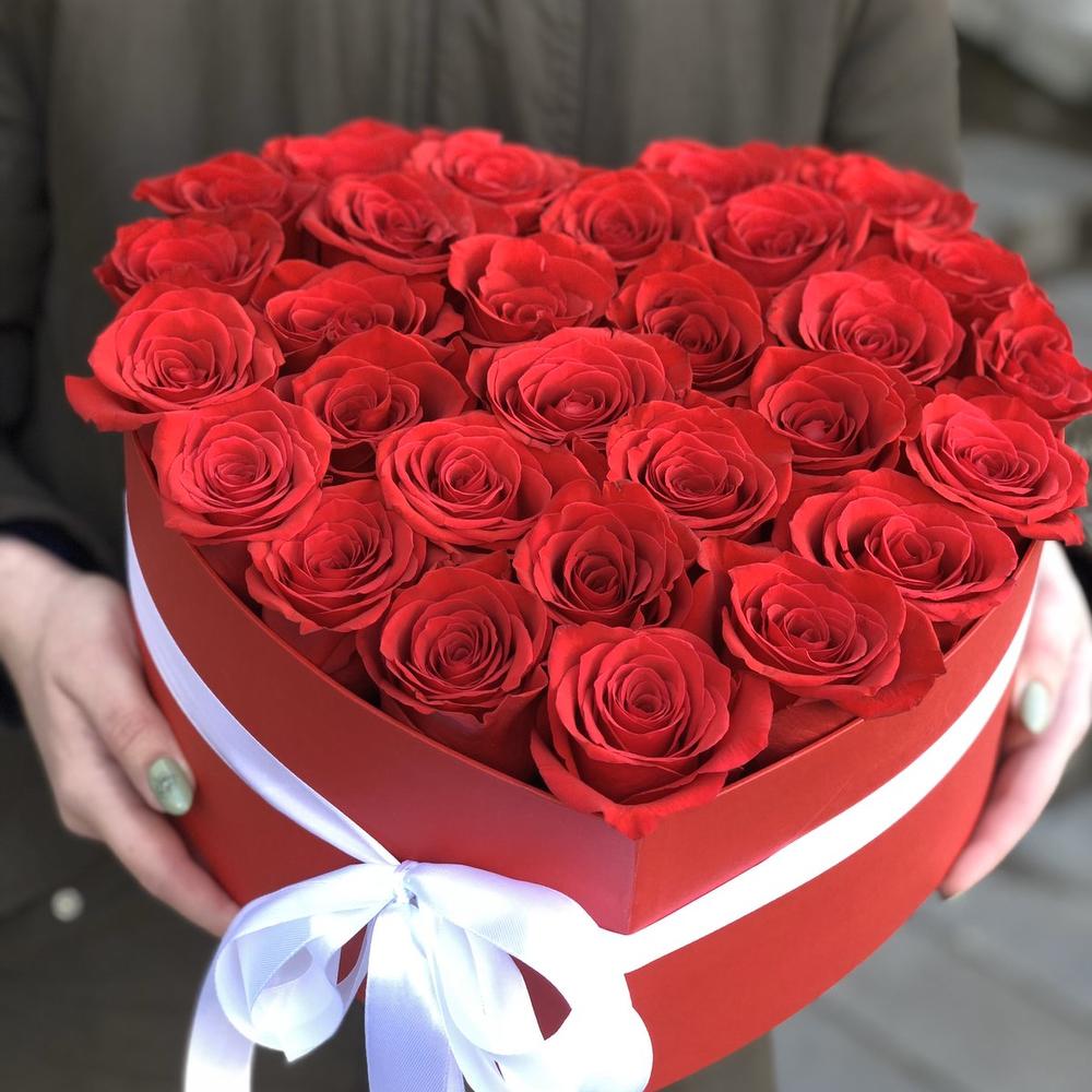 Роза красная – 29 шт. Коробка сердце – 1 шт. атласный бант – 1 шт. Оазис – 2 шт.