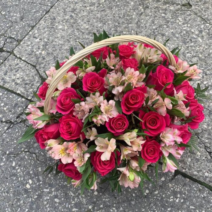 Корзина с розовыми розами и альстромериями «Синтия»