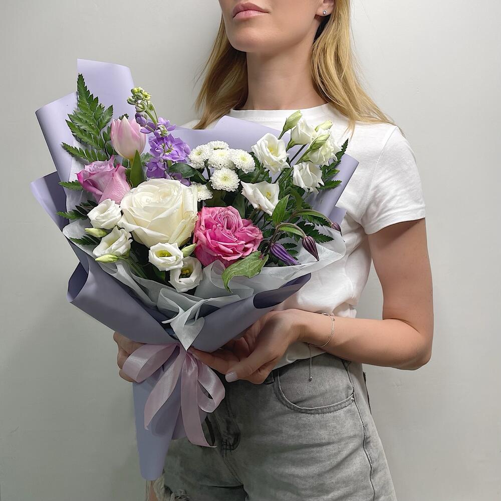Роза пионовидная – 1 шт.Роза белая – 1 шт.хризантема коконат – 1 шт.Маттиола – 1 шт.Тюльпан – 1 шт.Лизиантус – 1 шт.Папоротник – 2 шт.Клематис – 1 шт.Упаковка дизайнерская – 1 шт.