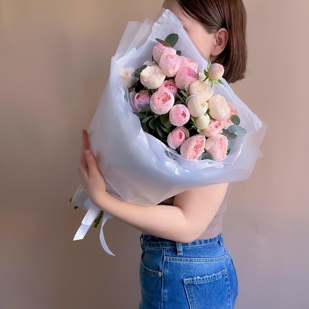кустовая пионовидная роза мэнсфилд парк – 5 шт.Эвкалипт – 3 шт.Упаковка дизайнерская – 1 шт.