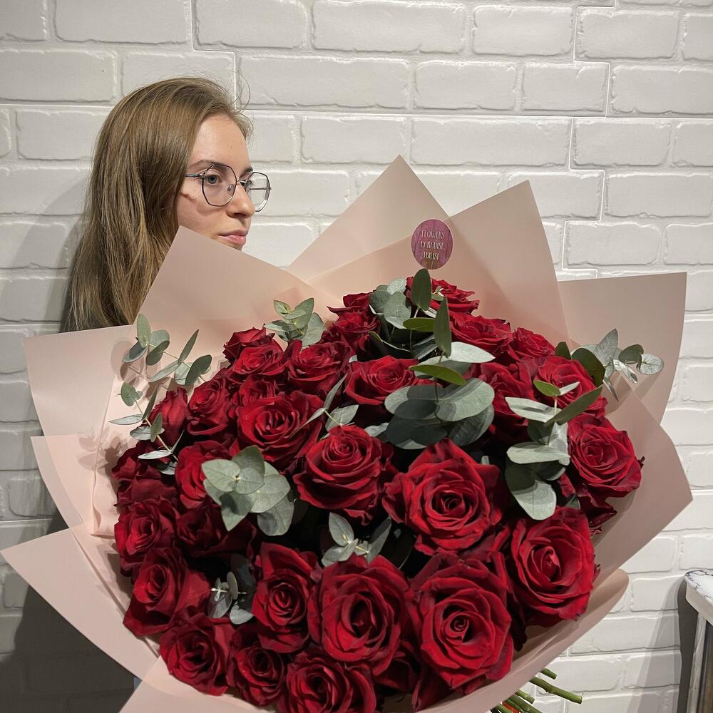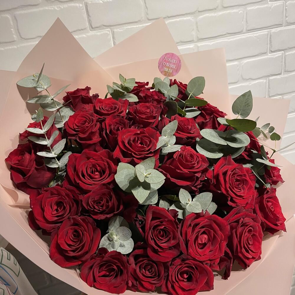 Красная роза – 31 шт. Эвкалипт – 7 шт. Упаковка – 1 шт. Атласная лента – 1 шт.