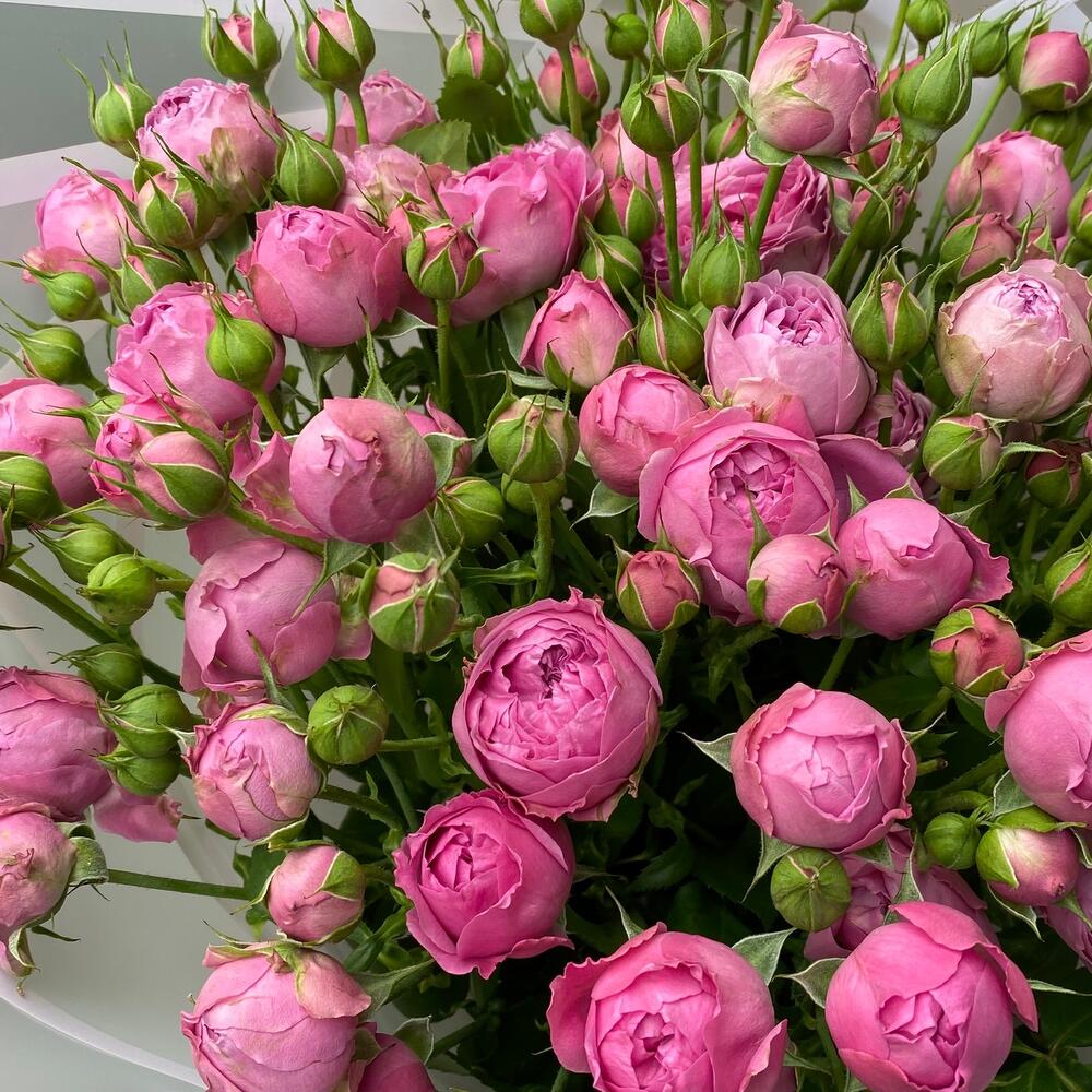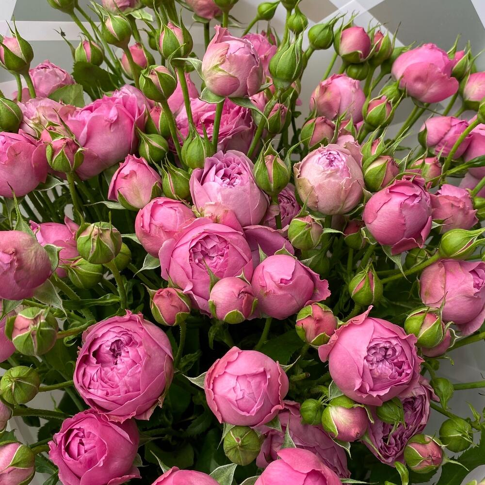 Лента атласная – 1 шт.Упаковка дизайнерская – 5 шт.роза кустовая пионовидная мисти бабл – 15 шт.