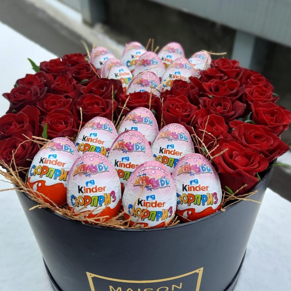 Роза красная – 25 шт. Киндер сюрприз – 16 шт. Коробка черная – 1 шт.