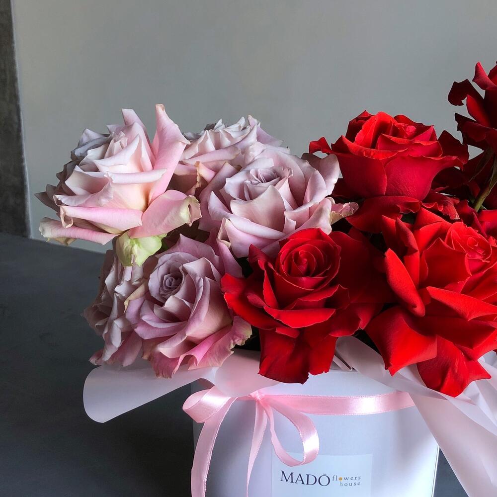Коробка заполнена цветами со всех сторон, пустых мест нет!Дизайнерская композиция 50/50 из самых крутых сортов роз. Пудровая роза, редкого оттенка Faith и, по-настоящему, АЛАЯ, а не бордовая роза Nina. Каждый бутон раскрыт вручную по специальной технике для большей пышности и «Вау!» эффекта. На стойкость и качество цветка раскрытие никак не влияет.Все наши букеты доставляются в воде и транспортировочной коробке, поэтому можете быть уверены, что каждый цветок доедет в целости и сохранности:)Не храните букет возле отопительных приборов и под прямыми солнечными лучами! Раз в два дня в губку можно подливать пол стакана воды.