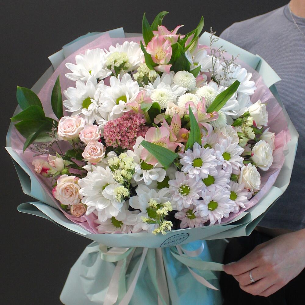 Хризантема – 4 шт. Сантини – 1 шт. Кустовая роза – 2 шт. Альстромерия – 2 шт. Рускус – 1 шт. Лимониум – 1 шт. Статица – 2 шт.