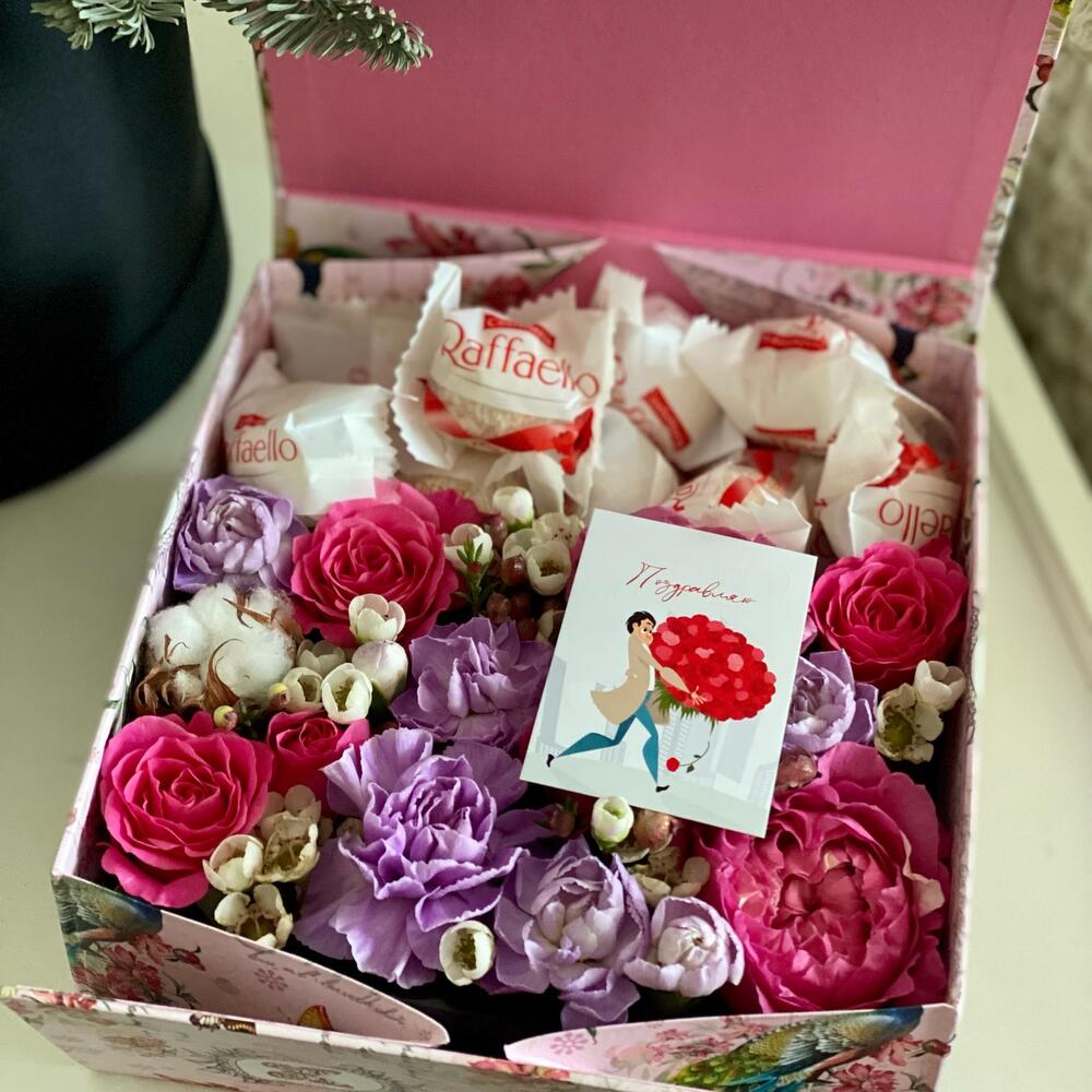 Цветы + сладости = идеальный подарок на любой повод дарения. Цветы в губке не требуют специального ухода, коробочка легко транспортируется и в дальнейшем может быть использования под другие цели.