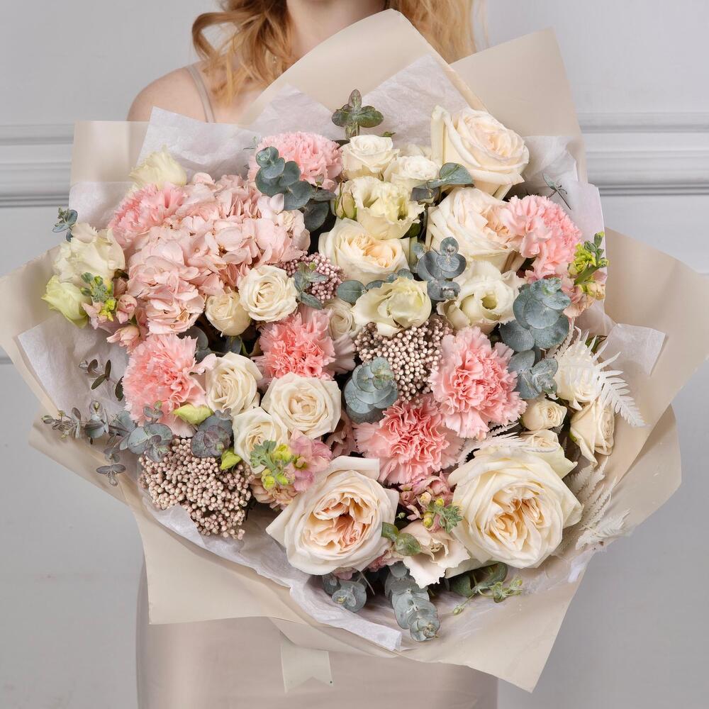 Гортензия – 1 шт.Эвкалипт – 5 шт.Маттиола – 7 шт.Эустома – 4 шт.Озотамнус – 3 шт.Диантус – 7 шт.Кустовая пионовидная роза – 5 шт.white o’hara – 5 шт.Упаковка дизайнерская – 2 шт.Писташ – 1 шт.Папоротник – 3 шт.