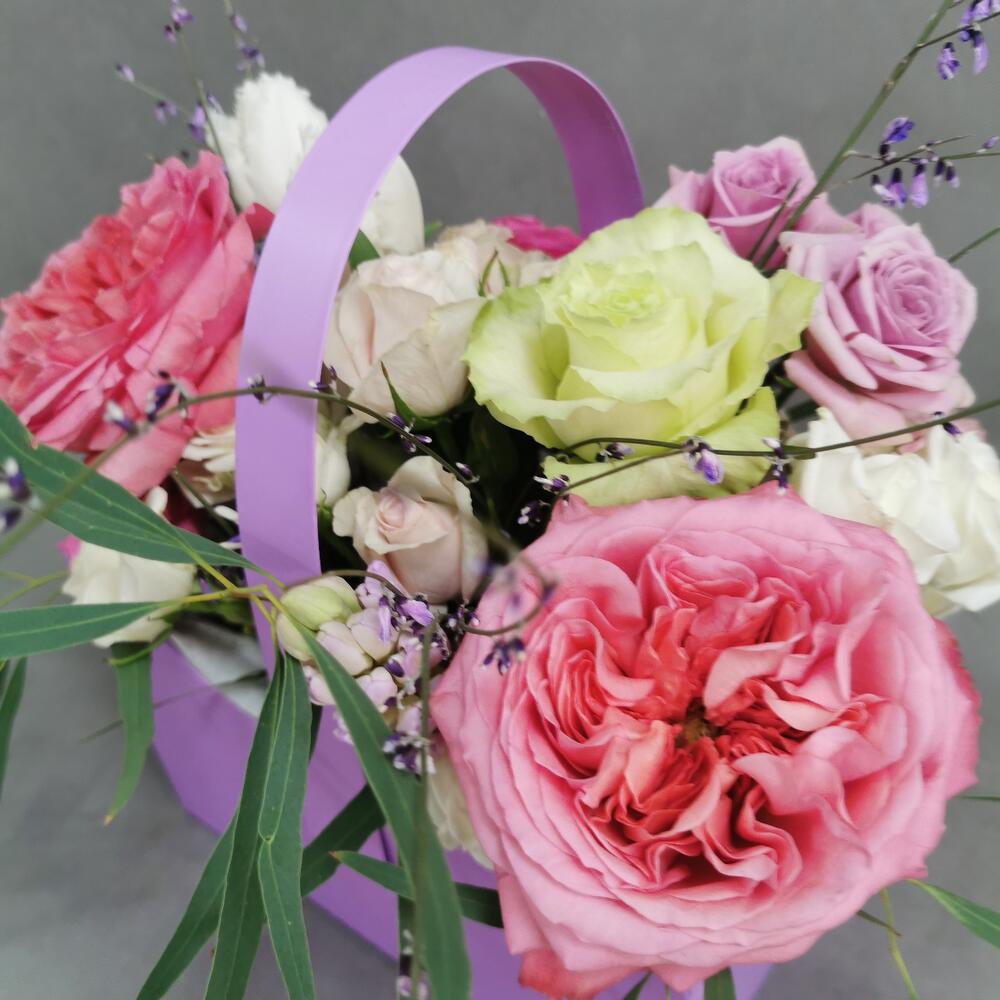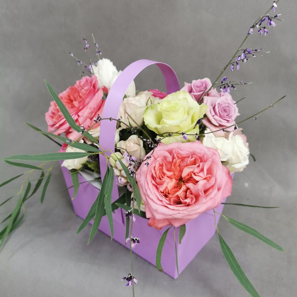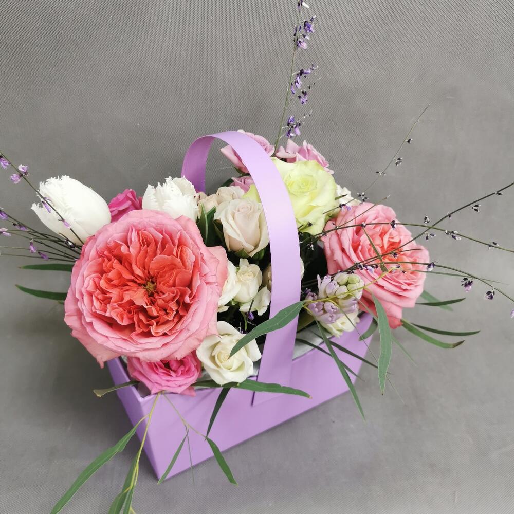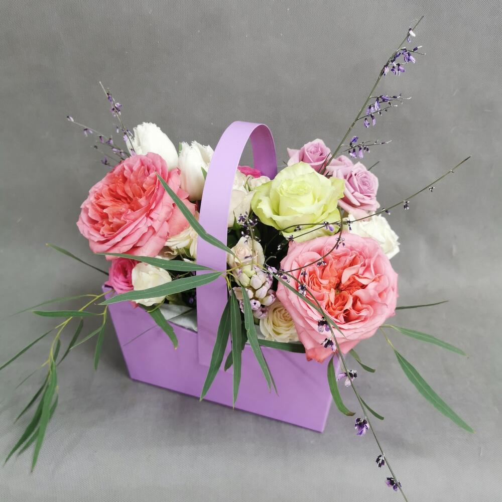 Пионовидная роза – 2 шт. Кустовая роза – 5 шт. Тюльпан – 2 шт. Гениста – 2 шт. Роза одноголовая – 2 шт. Эвкалипт – 1 шт. Гиацинт – 1 шт. Оазис – 1 шт. Сумочка – 1 шт. Открыточка с вашими пожеланиями – 1 шт.