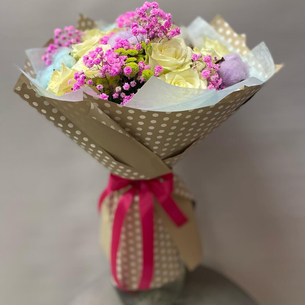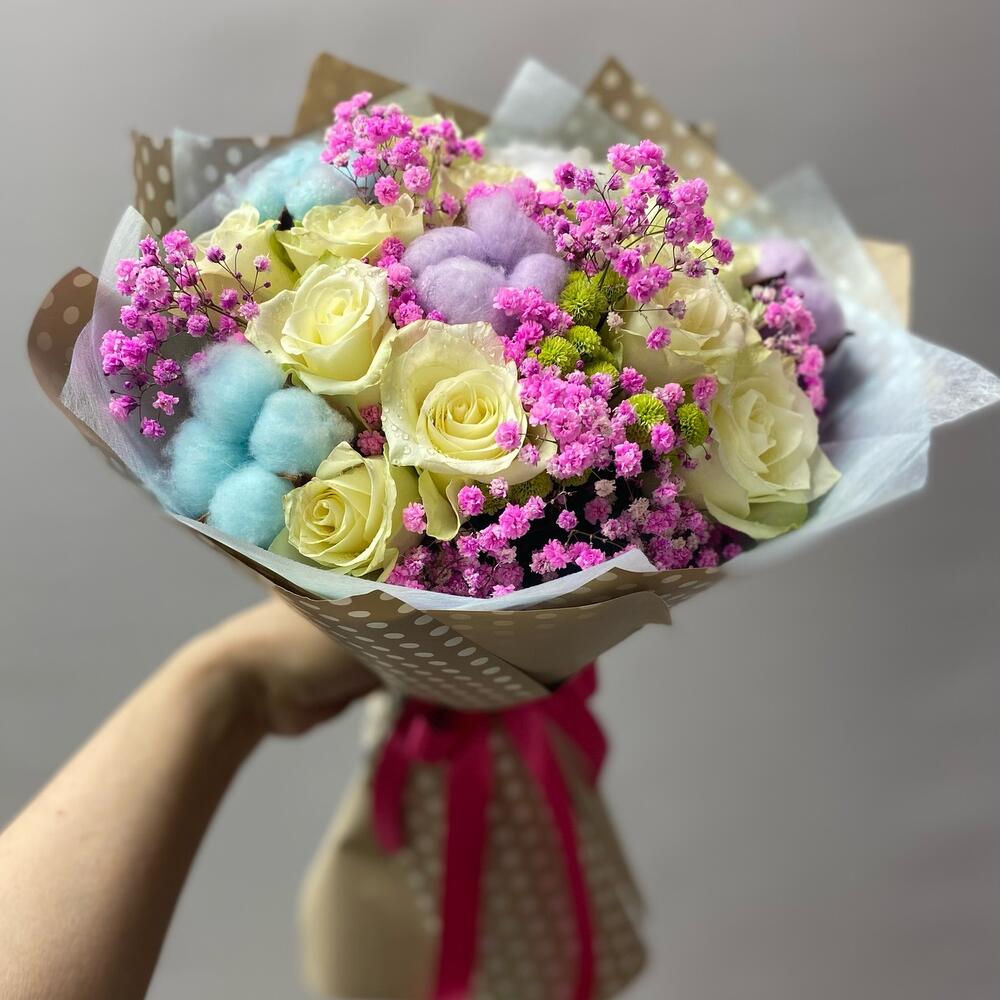 Роза – 11 шт.Гипсофила – 2 шт.Сантини – 2 шт.хлропок – 5 шт.Упаковка дизайнерская – 4 шт.