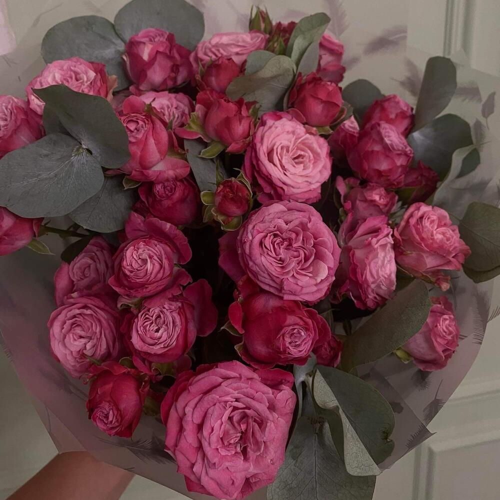 кустовые пионовидные розы – 11 шт. Эвкалипт – 5 шт. Упаковка дизайнерская – 1 шт. Открыточка с вашими пожеланиями – 1 шт.