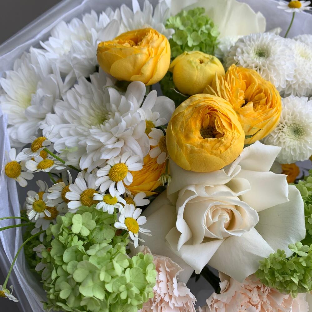 Вибурнум – 2 шт.Гвоздика кремовая – 4 шт.Хризантема кустовая – 1 шт.Лента атласная – 1 шт.Матрикария – 2 шт.Упаковка дизайнерская – 1 шт.Кризал (подкормка) – 1 шт.Аквапак – 1 шт.хризантема coconut – 1 шт.инструкция по уходу за цветами – 1 шт.роза playa blanca – 3 шт.транспортировочная упаковка – 1 шт.роза sunny trendsetter – 2 шт.