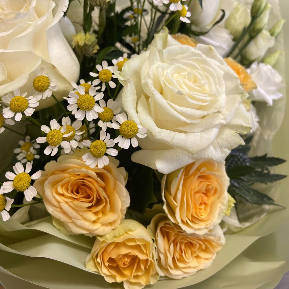 Категории: Кустовые розы, Лизиантусы, Розы, Ромашки