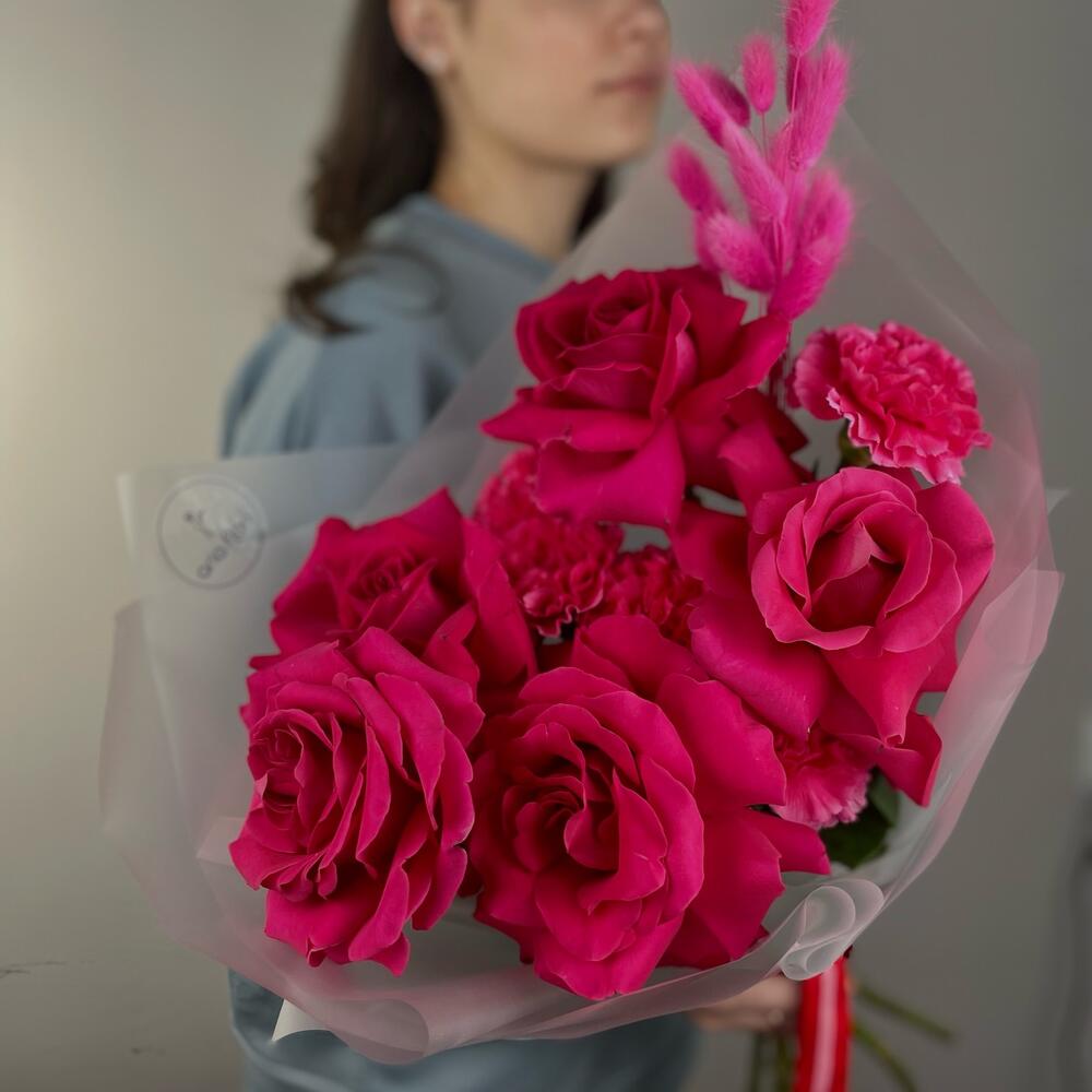 Множество малиновых оттенков в одном букете.Ароматные Розы Пинк Флойд в перемешку с гвоздиками и пушистым лагурусом. Мы используем для создания наших букетиков только качественный и свежий цветок Создаем букеты с невероятной любовью К букетику мы всегда прилагаем подкормку для цветочков – «chrysal”, чтобы они дольше сохраняли свою свежесть и красоту а также «Советы флористов» по уходу за срезанными цветочками Дополнительно к букетику Вы можете приобрести аквабоксы, транспортировочные коробки, крафтовые пакеты и вазы нужного размера