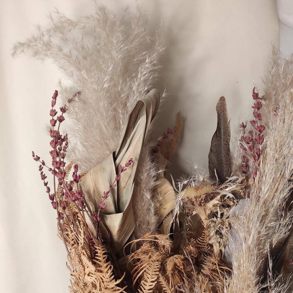 кортадерия – 4 шт.лаванда банч – 1 шт.перья фазан – 7 шт.Амми – 3 шт.карлина – 2 шт.пантус – 2 шт.папоротник стабилизированный – 5 шт.Перчик декоративный – 3 шт.Лента Кружево – 1 шт.