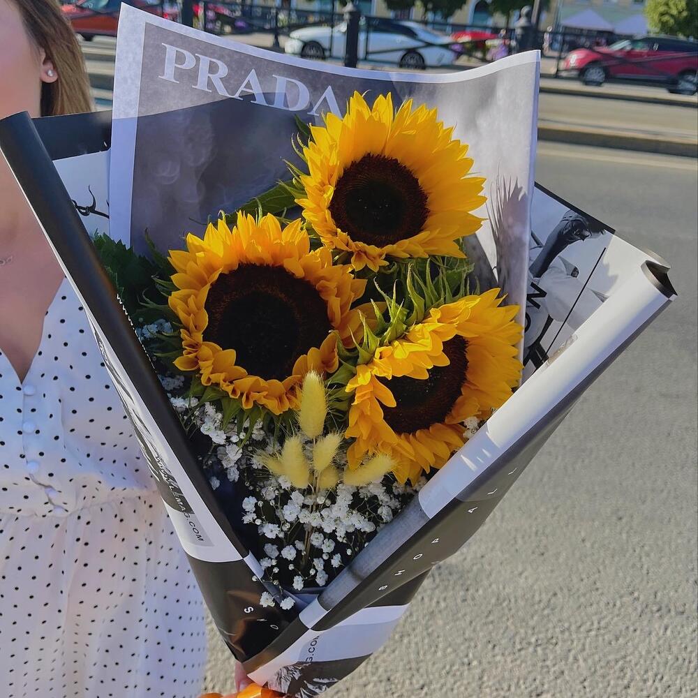 Гипсофила – 1 шт.Лента – 1 шт.Подсолнух – 3 шт.Сухоцветы – 3 шт.бумага дизайнерская – 1 шт.