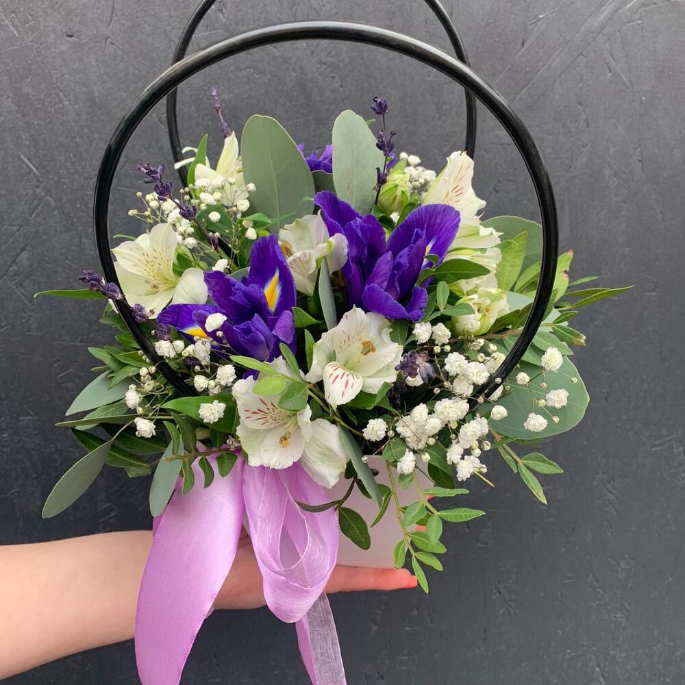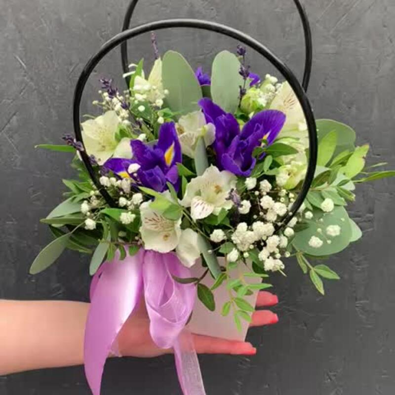 Ирис – 3 шт.Альстромерия – 3 шт.Гипсофила – 1 шт.Лаванда (сухоцвет) – 7 шт.Фисташка – 3 шт.Эвкалипт – 4 шт.Сумочка картонная – 1 шт.Оазис флористический – 1 шт.Лента атласная – 2 шт.