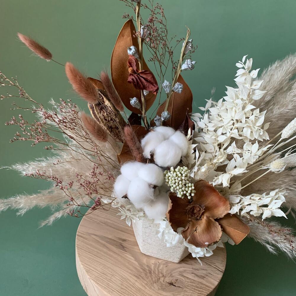 Кашпо керамическое – 1 шт.Оазис флористический – 1 шт.пампасная трава – 3 шт.Хлопок натуральный – 3 шт.цветок из коры – 1 шт.экзотический плод – 1 шт.ветки эвкалипта с плодами – 2 шт.иглица стабилизированная – 2 шт.фаларис сухоцвет – 7 шт.Лагурус (сухоцвет) – 7 шт.Лимониум – 2 шт.листья магнолии – 6 шт.Озотамнус белый – 2 шт.эрингиум мини стабилизированный – 3 шт.гортензия белая стабилизированная – 3 шт.пленка прозрачная упаковочная – 1 шт.
