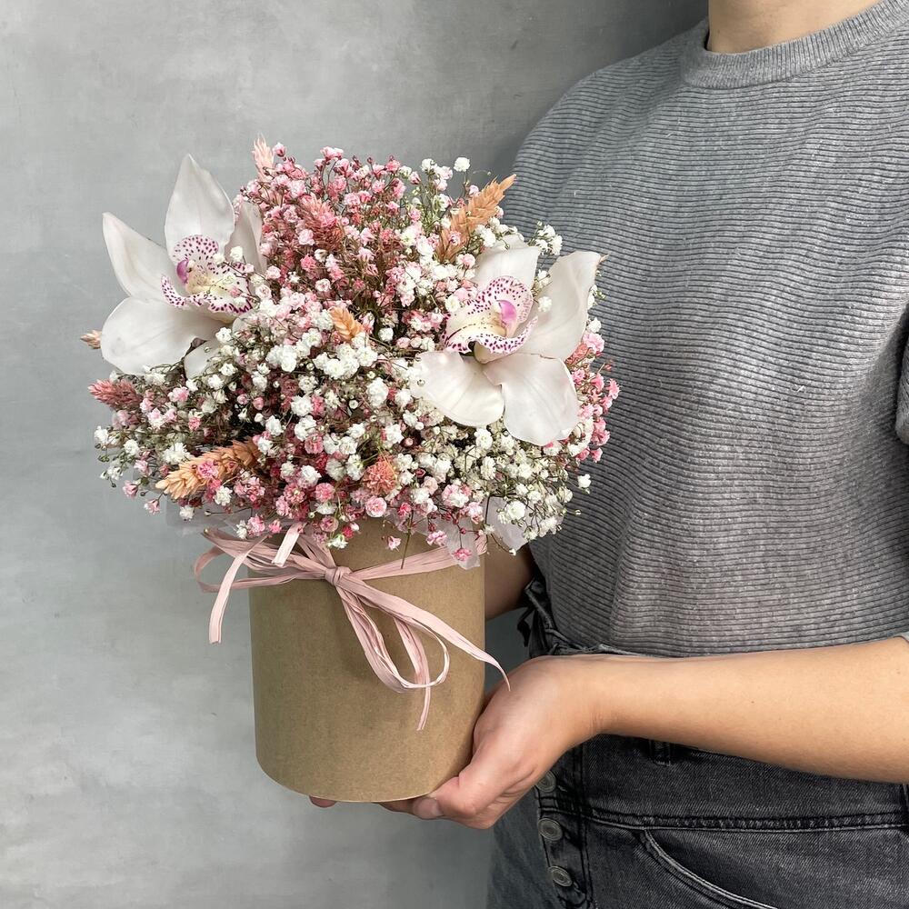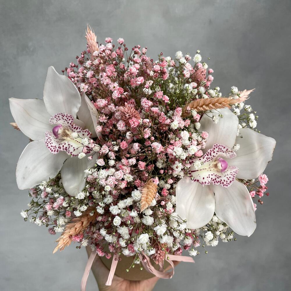 Гипсофила – 6 шт.Коробка – 1 шт.Орхидея цимбидиум микс – 3 шт.Лагурус (сухоцвет) – 11 шт.Пшеница (сухоцвет) – 9 шт.
