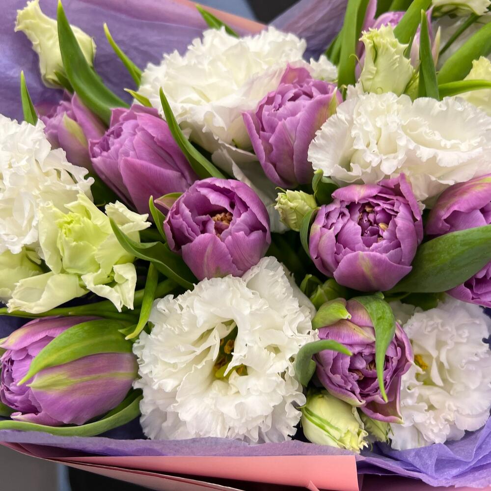 Тюльпан пионовидный – 9 шт.эустома махровая – 2 шт.Тишью – 2 шт.Пленка матовая – 2 шт.Лента атласная – 2 шт.